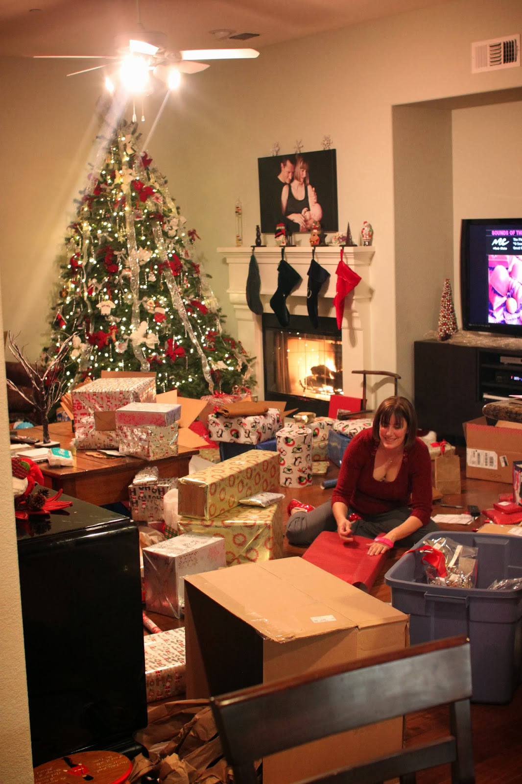 Two days before Christmas, Mama and Dada had their annual back-to-back wrapping marathon, with Christmas carols in the background. They started it once earlier so that I could participate, but apparently they didn't appreciate me running all over the place, stepping on the presents, and ripping the paper off the gifts as soon as they taped it on! Whoops! I'm also not so good at keeping a secret yet...so they didn't like it when I looked at something Dada was wrapping for Mama and named it out loud! So, we went to look at Christmas lights instead, and they wrapped gifts after I fell asleep.